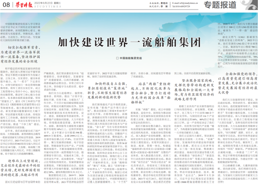 6月22日,《學(xué)習(xí)時報》發(fā)表中國船舶集團(tuán)黨組署名文章《加快建設(shè)世界一流船舶集團(tuán)》,萬山磅礴看主峰,大潮奔涌好揚(yáng)帆,面向新征程,中國船舶集團(tuán)將踔厲奮發(fā)、勇毅前行,為發(fā)展壯大國有經(jīng)濟(jì)貢獻(xiàn)更大力量,以優(yōu)異成績迎接黨的二十大勝利召開。